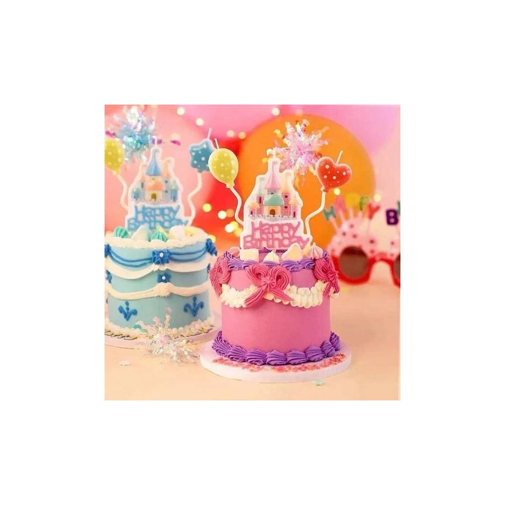 Dodejte narozeninovému dortu pohádkové kouzlo! Tato sada obsahuje svíčku s nápisem Happy Birthday doplněnou o zámek a dvě svíčky ve tvaru balónků. Vytváří krásnou, veselou dekoraci, která rozzáří každý dort. Výška zámku: 8 cm Výška balónků: 11 cmDoplňkové parametry