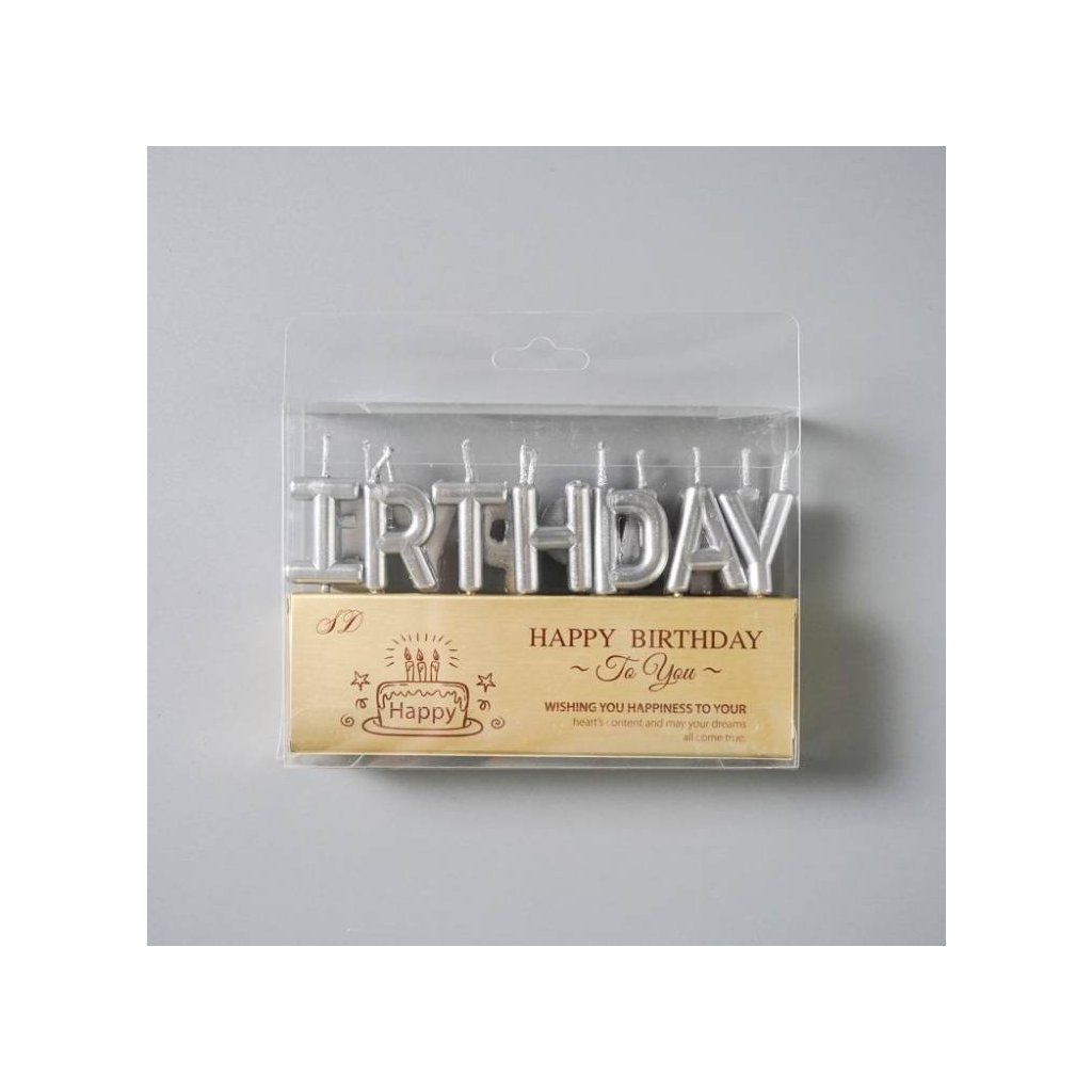 Narozeninové svíčky na dort ve tvaru nápisu Happy Birthday. Výška písmen: 2,5 cmDoplňkové parametry