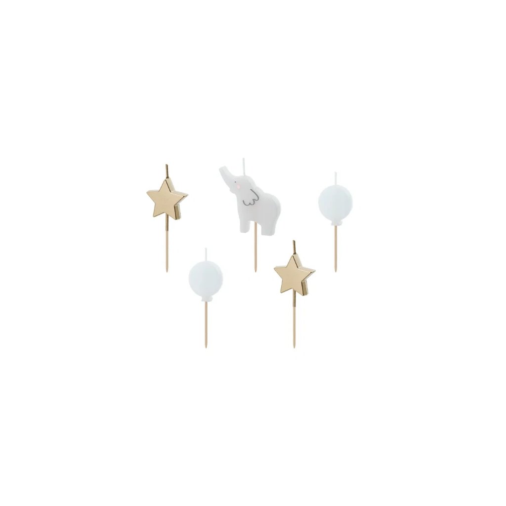 Malé svíčky se slonem. Balení obsahuje také hvězdičky a balonky. Tahle dekorační libůstka, kterou upozorníte na věk oslavence Vám ozdobí dort nebo cupcake jedna báseň. Nutný doplněk na vaší oslavě narozenin. Počet: 5 ks. Velikost: 3-5 cmDoplňkové parametry