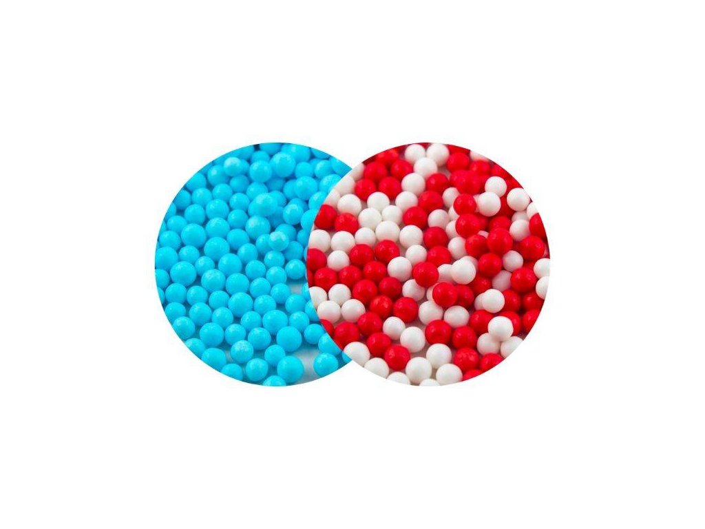 Produkt pro domácí cukráře: SweetArt cukrové perly nebesky modré, červené a bílé 5 mm (120 g) ▹,
