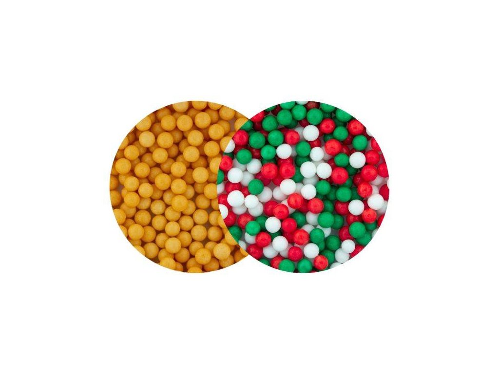 Produkt pro domácí cukráře: SweetArt cukrové perly zlatožluté matné a Christmas mix 5 mm (120 g) ▹,