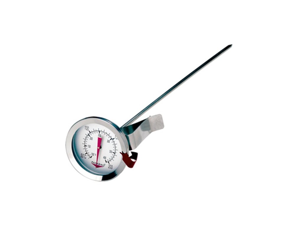 Vpichovací teploměr v nerezovém pouzdře na smažení nebo práci s karamelem. Délka 30 cm, průměr teploměru 5 cm. Stupnice v °C/°F.