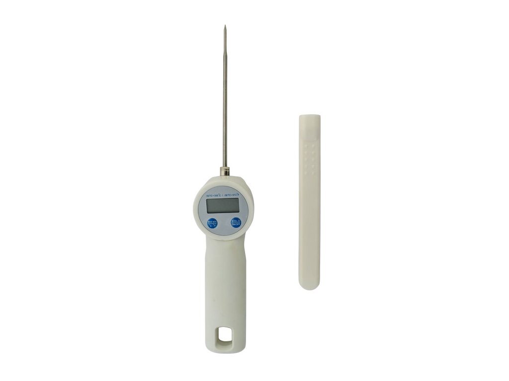 Digitální vpichovací teploměr. Teplotní rozsah od -50°C do +300°C. S jehlou délky 12 cm. Odchylka měření 1°C (od -50do 100°C) a 2,5°C (od 100 do 300°C). Vhodný pro práci s potravinami.