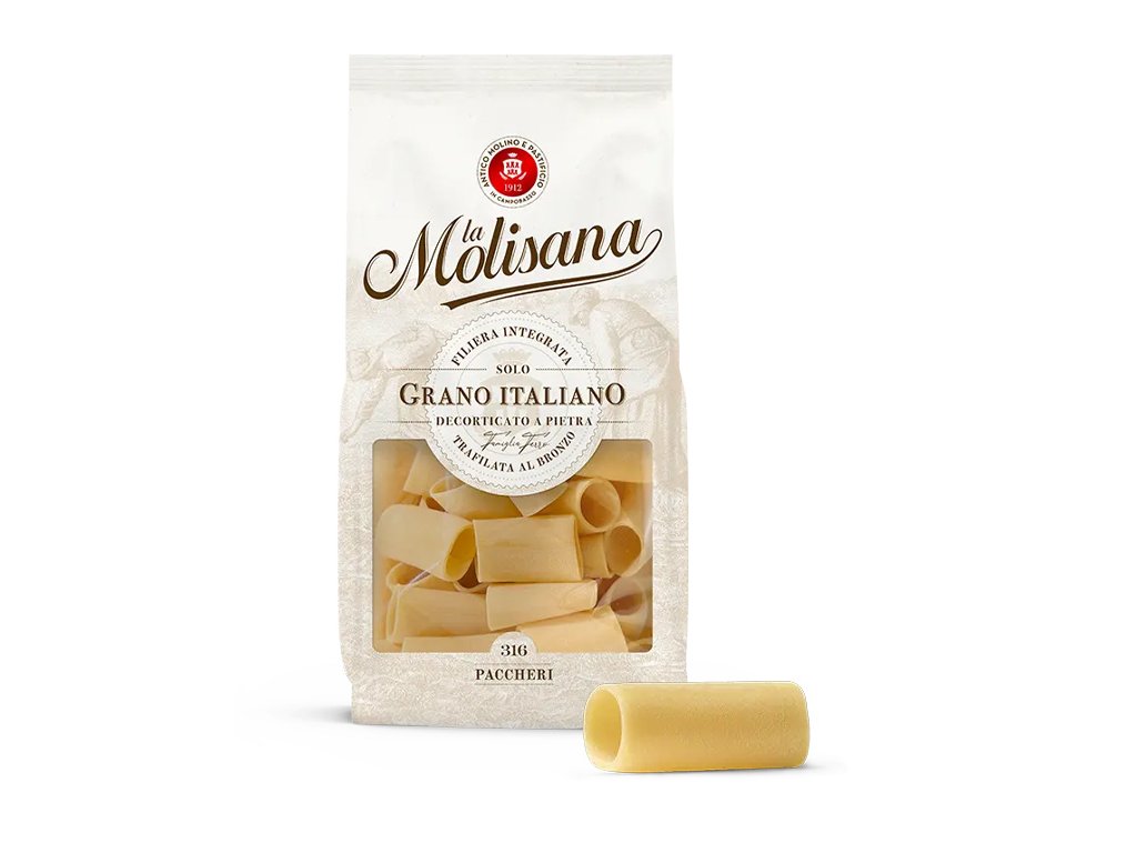 Původ těstovin Paccheri je jistě neapolský. Název, který v italštině zní velmi zvukomalebně, je zřejmě odvozen od slova ‚paccarià‘, tedy facka. Verze od La Molisana, vylisovaná na bronzové matrici, má velikost, která je běžně velmi ceněná a podává se s parmicí v rajčatové omáčce, ochucené petrželkou, nebo s lilkem a sýrem quartirolo, provoněné citrusovou kůrou.