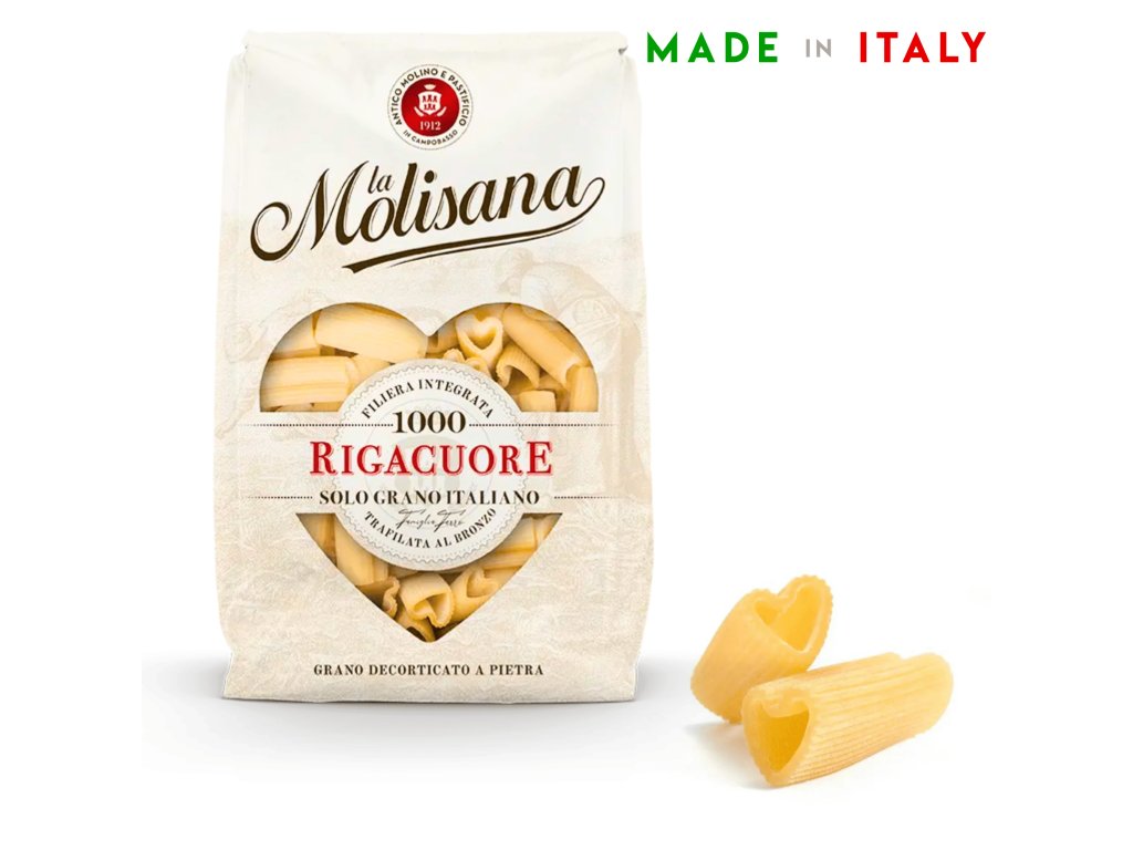 Rigacuore je exkluzivní formát, který vyjadřuje veškerou naši lásku k těstovinám. Díky svému charakteristickému tvaru srdce tento inovativní, zábavný a trendy formát těstovin ještě více umocňuje potěšení z těstovin a spojuje je s emocemi, touhou a pocitem. S Rigacuore představuje Molisana nový spotřebitelský zážitek, díky dvojitému přehybu formátu vytváří v ústech větší objem a znásobuje tak potěšení ze samotného žvýkání. Díky bronzové kresbě italské pšenice zachytí drsný povrch Rigacuore každý typ koření a vaření je vždy jednotné ve všech částech: pro nás v La Molisana je bronzová kresba určujícím faktorem pro vylepšení vlastností těstovin a prodloužení požitku. Rigacuore jsou supertuhé těstoviny ve tvaru srdce, díky vysokému obsahu bílkovin, nikdy ne nižším než 14 %, a pocházejí ze 100% integrovaného dodavatelského řetězce těstovin, který začíná pečlivým výběrem pšeničných zrn a poté následuje každou fázi výroby a nakonec přináší na stůl to nejlepší a lásku ke 100% italským pšeničným těstovinám.