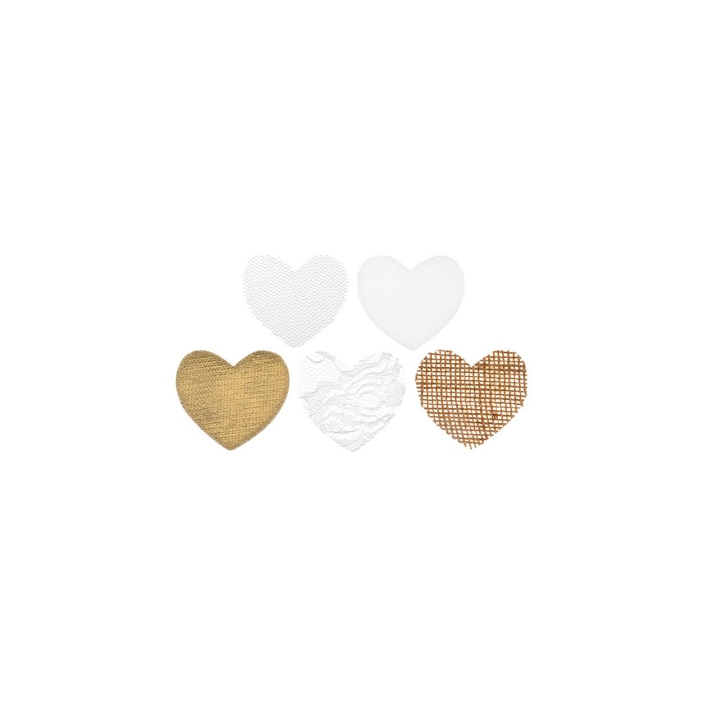 Textilní svatební konfety ve tvaru srdcí o průměru 5 cm. Každé srdce je vyrobeno z látky, například z juty, tylu nebo bavlny. Konfety můžete požít jako doplněk k dekoraci svatebního stolu. Dají se ale použít i u jiné příležitosti jako je Valentýn nebo tematické party ale i oslavy narozenin. Materiál: juta, tyl, bavlna. Velikost 5,5 x 5 cm Balení: 25 ksDoplňkové parametry