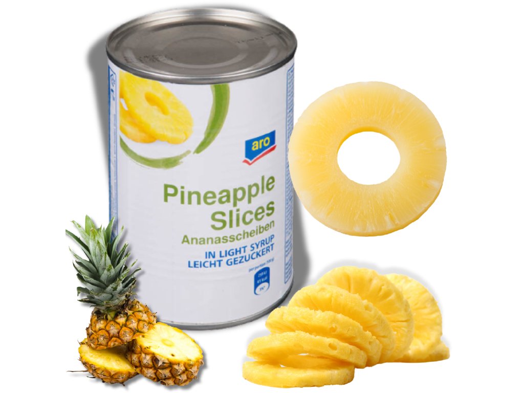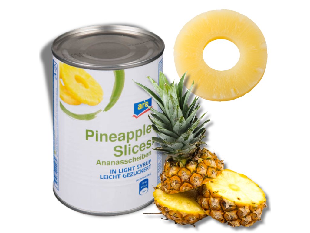 Zákonný název potraviny: Ananas ve sladkém nálevu. Konzervované jednodruhové ovoce s nálevem. Pasterováno.
