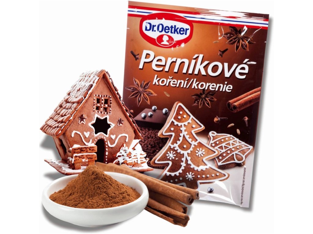 Voňavá směs prvotřídního koření (skořice, hřebíček, koriandr, fenykl, anýz, nové koření, muškátový květ, muškátový ořech, badyán) pro přípravu vánočního pečiva, perníčků, medovníků, perníku i jako koření do povidel a jiných receptů.Perníčky: V míse utřeme 2 vejce, 140 g moučkového cukru a 100 g změklého másla. Přidáme 2 polévkové lžíce tekutého medu a 3-4 kávové lžičky Perníkového koření Dr. Oetker a krátce zamícháme. Poté přidáme 400 g hladké mouky, 1 kávovou lžičku Jedlé sody Dr. Oetker a ručně vypracujeme hladké těsto. Necháme asi 30 minut v chladničce odpočinout. Na pomoučené pracovní ploše těsto vyválíme na silnější plát. Formičkami vykrajujeme různé tvary, které dáváme na plech vyložený papírem na pečení v dostatečné vzdálenosti od sebe. Pečeme asi 8 minut v předehřáté troubě při 180 °C. Perníčky po vychladnutí ozdobíme.