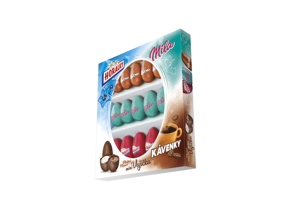 - Mléčná čokoláda (48%) s arašídovou krémovou náplní (52%), Mléčná čokoláda (48%) s mléčnou krémovou náplní (52%), Mléčná čokoláda (48%) s kávovou krémovou náplní(52%)