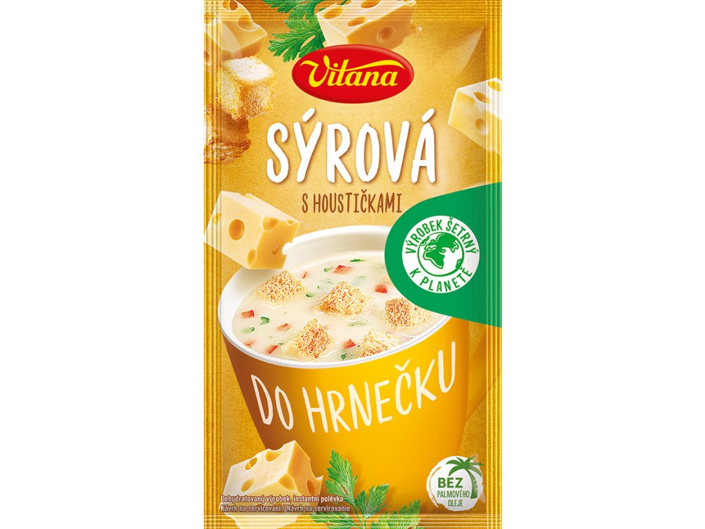 - Složení (suché směsi): Modifikovaný škrob, smažená houska 14% (pšeničná mouka, palmový tuk, jedlá sůl, droždí), sušená smetana, sýrový prášek 11% (sýr, syrovátka, mléčné kvasinky), tuková báze (slunečnicový olej, glukózový sirup, mléčná bílkovina), palmový tuk, jedlá sůl, aromata, sýrový prášek ementál 6% (sýr, syrovátka, aroma, jedlá sůl, směs koření), cukr, kvasnicový extrakt, zahušťovadlo xanthan, sušená červená paprika, petrželová nať 0,3%, kurkuma.