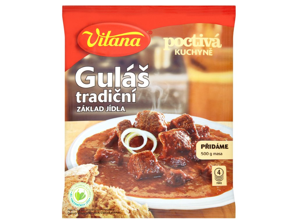 - 1. 500 g nesoleného masa (vepřového či hovězího) nakrájíme na kostky a prudce opečeme na oleji.2. Vsypeme obsah sáčku, důkladně promícháme a přidáme 500 ml vlažné vody.3. Vaříme pozvolna pod pokličkou, za občasného míchání, dokud není maso měkké (přibližně 55 – 60 minut).Stejným způsobem můžeme připravit guláš v tlakovém hrnci. V tomto případě přidáme pouze 300 ml vlažné vody a vaříme mírným varem asi 20 minut.