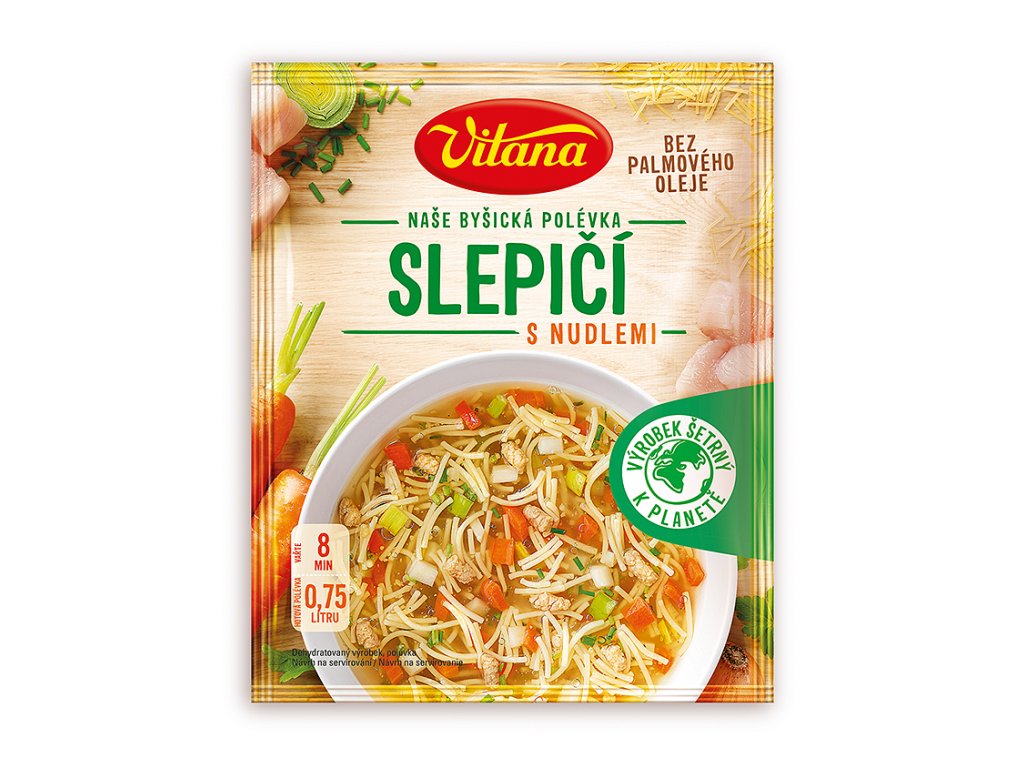 - vaječné těstoviny (pšeničná mouka, vejce) 53 %, maltodextrin, jedlá sůl, sušené kuřecí maso 8,5 % (pšeničná mouka, kuřecí maso 47 %, vaječný bílek, pekařské droždí, jedlá sůl, antioxidant rozmarýnový extrakt), slepičí tuk (obsahuje antioxidant rozmarýnový extrakt) 3 %, sušená zelenina (karotka 2,4 %, cibule 1,8 %, celer 1,6 %, pórek 0,3 %, pažitka 0,3 %), aromata (obsahují vejce), cukr, sušené slepičí maso 0,3 %, směs koření, kyselina citronová.