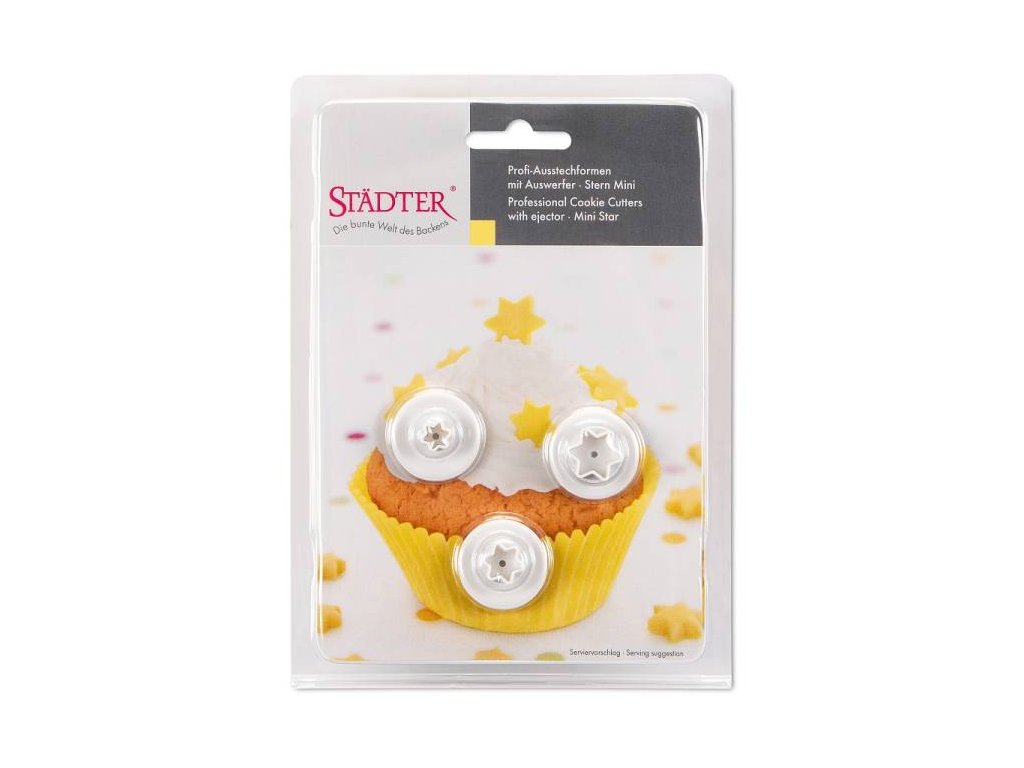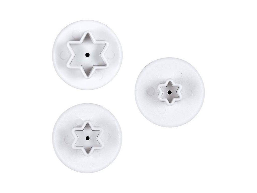 Sada 3 ks plastových vykrajovátek různých rozměrů ve tvaru hvězdy. Součástí sady je plastový píst.Doplňkové parametry
