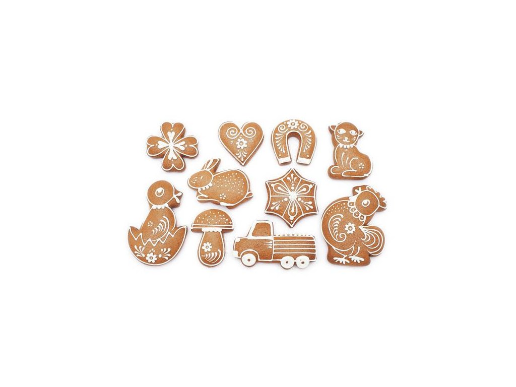Vykrajovačky jsou zhotoveny ze zdravotně nezávadného a dostatečně odolného pocínovaného plechu, horní okraj je pro lepší udržení tvaru i bezpečnost při práci s nimi přehnut a tím zdvojen, takže tvoří oblou hranu. Mezi motivy najdete například podkovu pro štěstí, autíčko, letadlo, hříbek, motýla, miminko v zavinovačce, vějíř, trojlístek, srdíčko z lásky, květ nebo vzor s lístky. Výsledné tvary budou střední velikosti, použitelné samostatně jako zákusky nebo přílohy ke kávě či čaji, lze je ale použít i při zdobení dortů nebo jiného svátečního pečiva.
