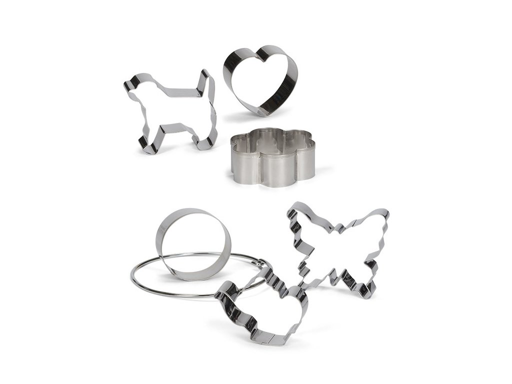 Nerezová vykrajovátka s kruhem na cukrářské a pekařské výrobky. Mají tvar motýla, psa, kruhu, květu, srdce a čajové konvice.