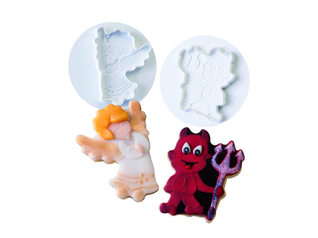 Plastové vykrajovátko s vytlačovačem na marcipán a cukrové hmoty. Sada obsahuje dva vytlačovače: motiv anděla a čerta.