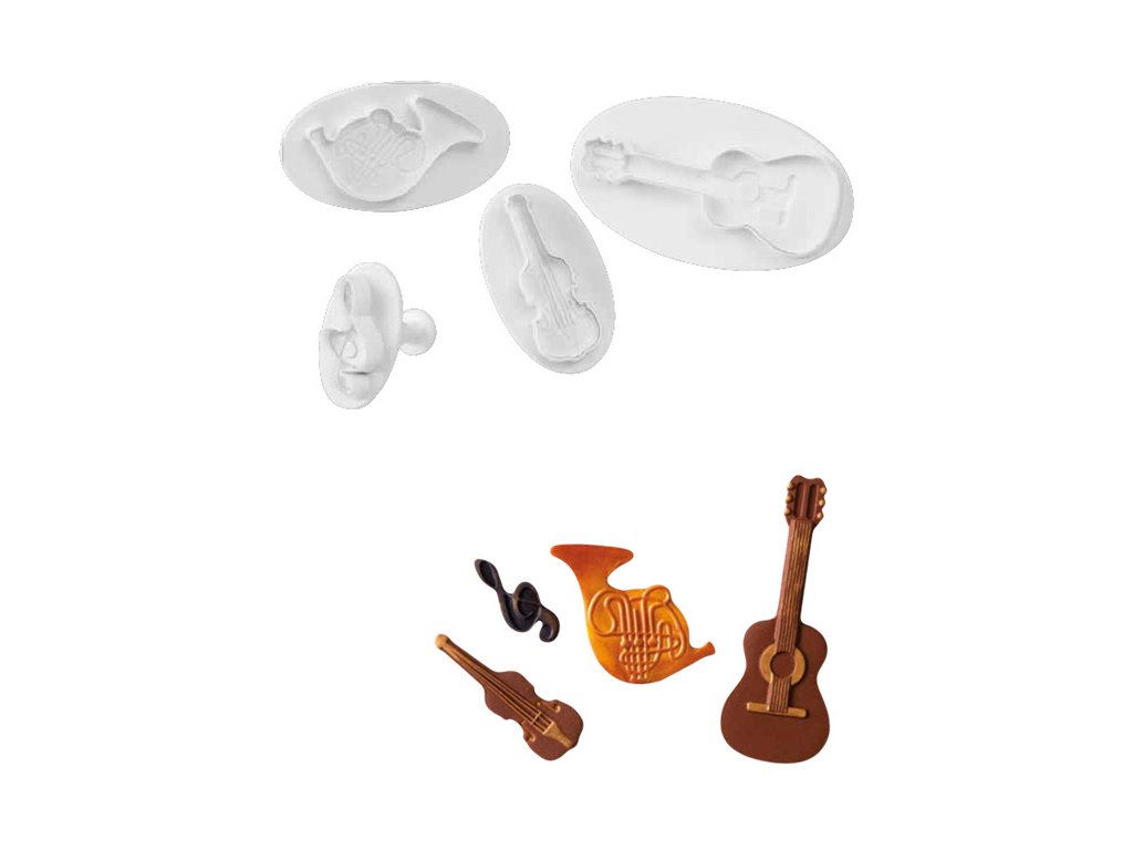 Plastové vykrajovátko s vytlačovačem na marcipán a cukrové hmoty. Sada obsahuje čtyři vytlačovače s hudebními nástroij a houslovým klíčem (kytara; housle; lesní roh). O velikosti 10,7x4,2, 6,7x3,4, 7,4x4,3 a 4,2x1,9cm.