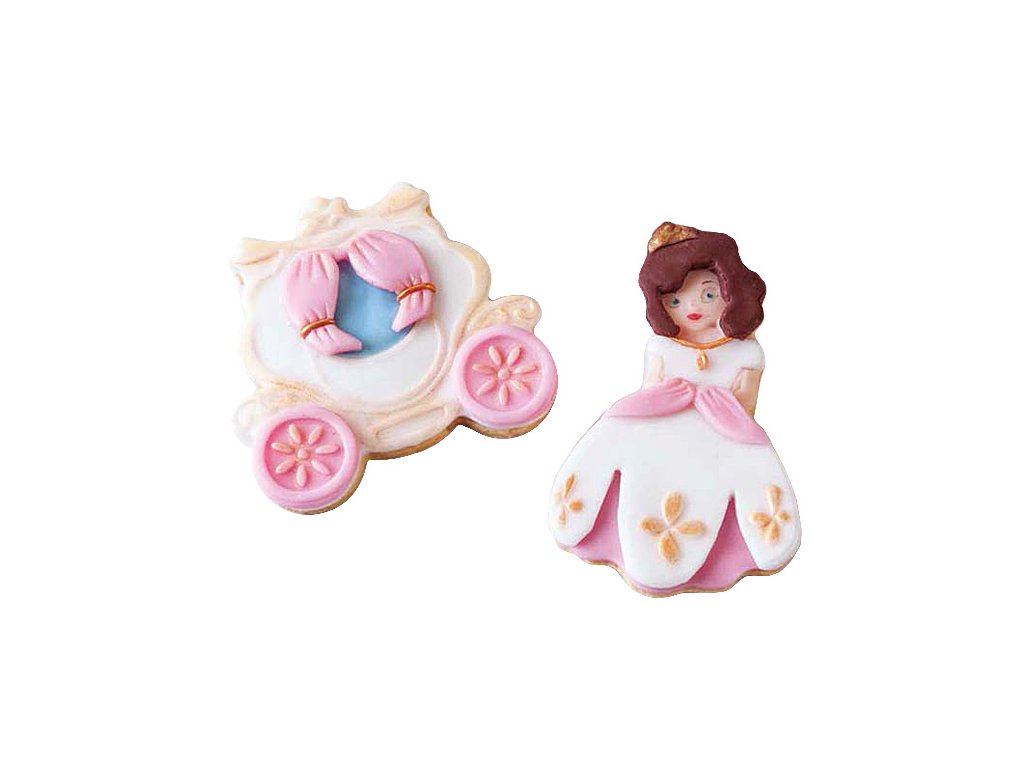 Plastové vykrajovátko s vytlačovačem na marcipán a cukrové hmoty. Sada obsahuje dva vytlačovače: motiv kočár s princeznou.