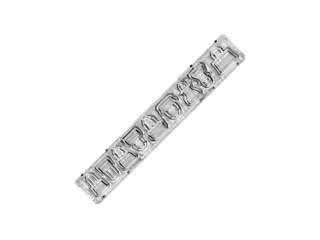 Celkový rozměr lišty: 24 x 3,5 cmRozměr největší kabelky: cca 2,7 x 2,5 cmPoužití: Fondánovou hmotu vyválíme na cca 1 mm. Z obou stran potřeme podsypovým cukrem, abychom zabránili jejímu přilepení na lištu. Lištu přiložíme na připravenou hmotu. Držíme ji jen za okraje a přitlačíme. Tím vykrojíme obvody ozdob. Poté jemně zatlačíme na středy ozdob a otiskneme do vykrojené hmoty reliéf. Pokud chceme ozdoby bez struktury, střed nemačkáme. Nakonec lištu zvedneme a stlačením středu lišty ozdoby vytlačíme ven.Doplňkové parametry