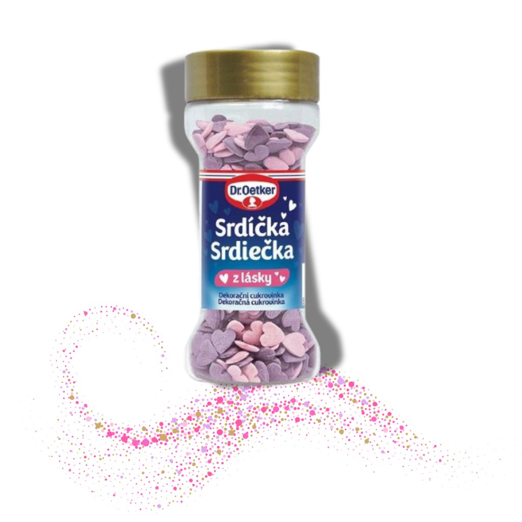 Praktická dóza obsahuje 2 druhy srdíček. Jedinečná dóza zajistí jednoduché a praktické zdobení perníčků, dětských narozeninových dortů nebo muffinů.