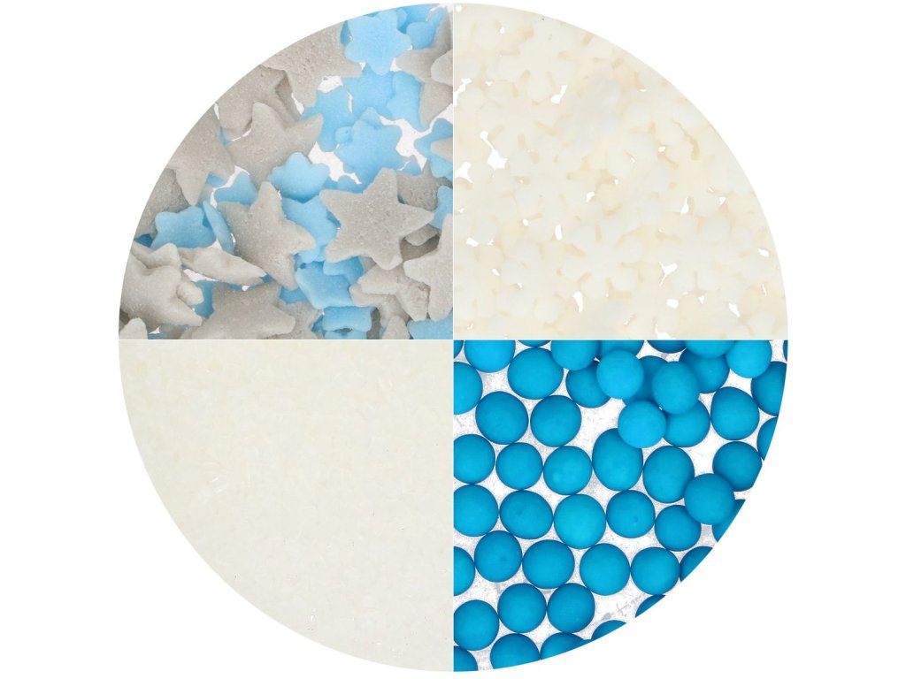 Ledově modré, bílé a stříbrné tóny pro mrazivý zimní vzhled - bílý perleťový cukr, modré a šedé hvězdičky, bílé krystalky cukru a modré cukrové perly.