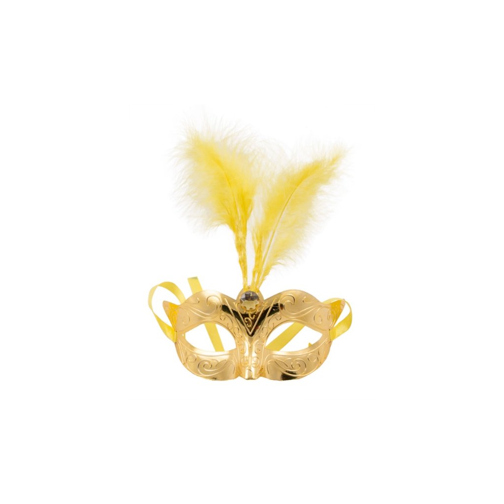 Zlatá Benátská škraboška s peřím, zdobená kamínkem je nejen hodní na plesy, ale najde své uplatnění i při karnevalu a samozřejmě oslavách Silvestra. Velikost: 23 x 23 cmMateriál: plast, peříBalení: 1 ksDoplňkové parametry